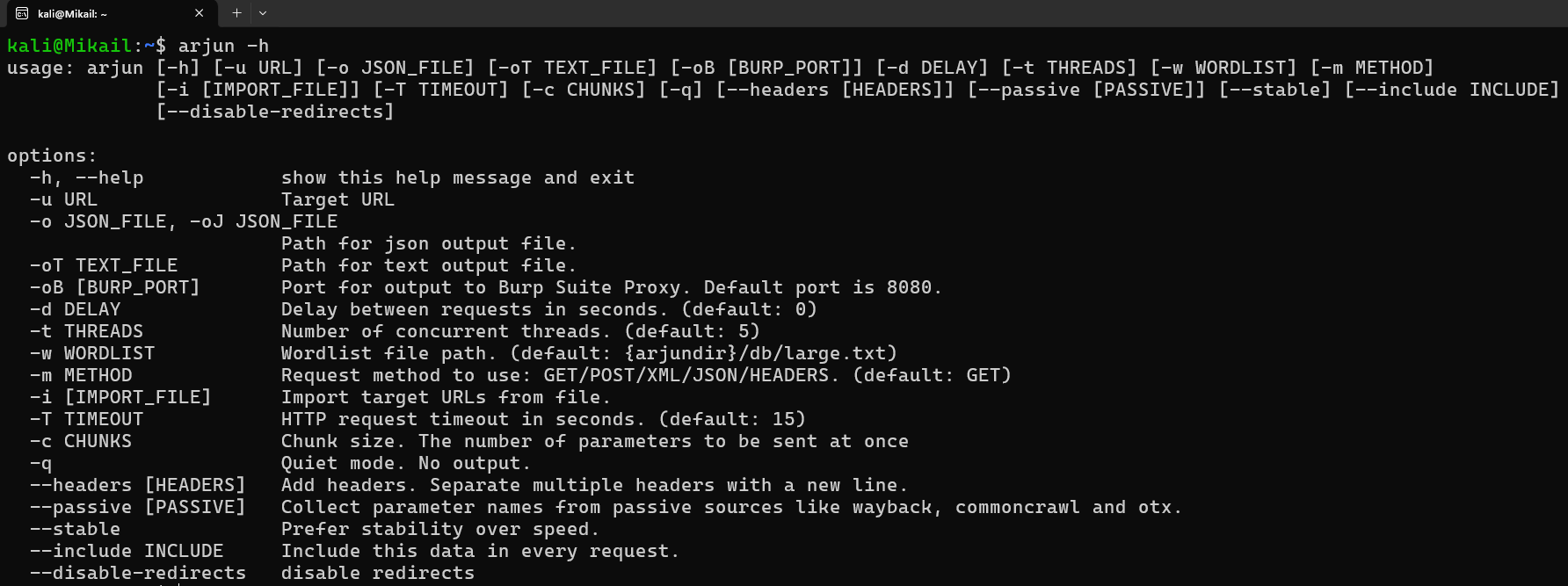 Öncelikle, Arjun'un parametrelerini incelemek için terminalde veya komut istemcisinde aşağıdaki komutu kullanarak Arjun'un yardım belgesini görüntüleyebiliriz: