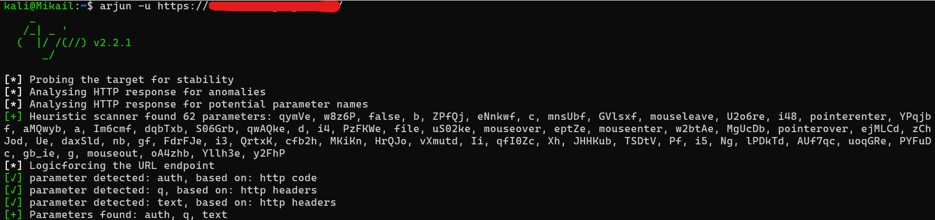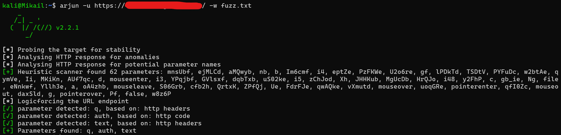 Burada verilen url de kullanıcı tarafından verilen wordlist üzerinde tarama yaparak "auth", "q" ve "text" parametrelerini keşfetmiştir.