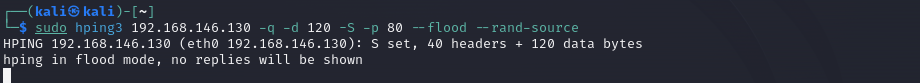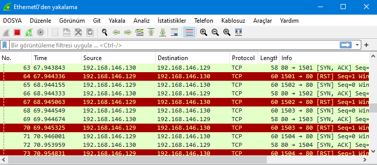 Görselde de göründüğü gibi bizim ip adresimizden (192.168.146.129) hedef ip adresine (192.168.146.129) çok sayıda SYN paketinin gittiği gözlemliyoruz. Ama bu şekilde saldırının bizim tarafından yapıldığı belli oluyor. Bunu önlemek için aşağıdaki komutta olduğu gibi --rand-source parametresini kullanabiliriz.