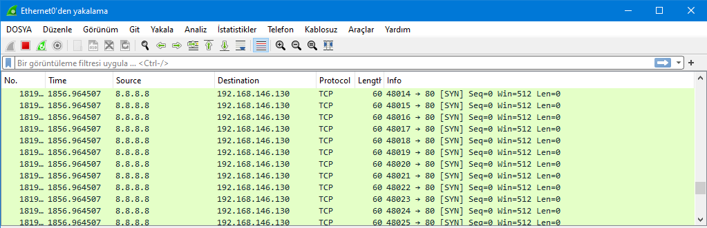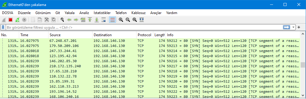 Görselde de göründüğü gibi rastgele ip adreslerinde hedefe çok sayıda paketin gittiği ve paketlerin Len değerinin bizim belirlediğimiz gibi 120 olduğunu gözlemliyoruz.